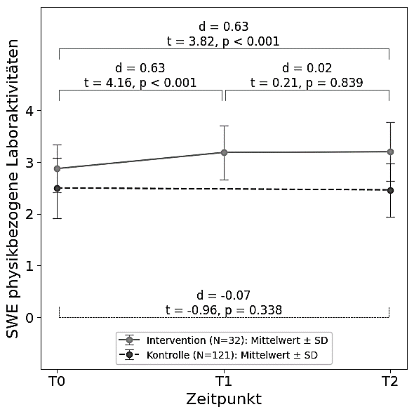 Abbildung 1 zeigt, wie sich die Selbstwirksamkeitserwartung der Personen in Bezug auf physikbezogene Laboraktivitäten über die Zeit verändert hat. Selbstwirksamkeitserwartung bezeichnet hierbei die Überzeugung, physikbezogene Laboraufgaben erfolgreich durchführen zu können. Bei den Schülerinnen der Interventionsgruppe stieg diese Selbstwirksamkeitserwartung nach der Projektwoche deutlich an (T0 zu T1; mittlerer Effekt). Drei Wochen später blieb dieser positive Effekt weitgehend erhalten (T1 zu T2). In der Vergleichsgruppe, die nicht an der Projektwoche teilgenommen hat, veränderte sich die Selbstwirksamkeitserwartung über die Zeit kaum.