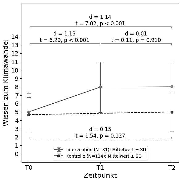 Die Ergebnisse zeigen, dass das Vorwissen zum Klimawandel sowohl in der Interventions- als auch in der Vergleichsgruppe zu Beginn etwa gleich war (Abb. 2). Bei den Schülerinnen der Interventionsgruppe führte die Projektwoche jedoch zu einem deutlichen Wissenszuwachs (T0 zu T1; großer Effekt), der auch drei Wochen später stabil blieb (T1 zu T2). In der Vergleichsgruppe ließ sich kein Wissenszuwachs feststellen.