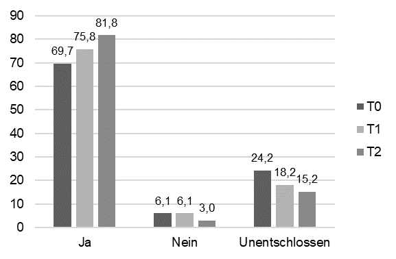 Zu Beginn der Projektwoche (T0) gaben 69.7% der Schülerinnen an, nach dem Schulabschluss ein Studium aufnehmen zu wollen (Abb. 3). Am Ende der Projektwoche (T1) stieg dieser Anteil auf 75.8% und drei Wochen danach (T2) weiter auf 81.8%. Der Anteil der Unentschlossenen sank (T0: 24.2%; T1: 18.2%; T2: 15.2%). Zudem hatten die Schülerinnen mehr Interesse an den Studienfächern Physik und Informatik als zuvor (nicht abgebildet).