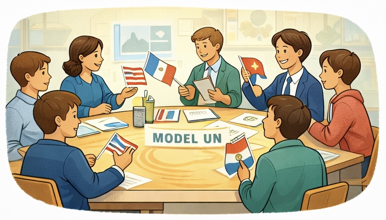 | Model UN ist eine simulationsbasierte Debattenmethode, bei der Lernende verschiedene Länder oder Positionen vertreten und gemeinsam über eine Problemfrage diskutieren. |